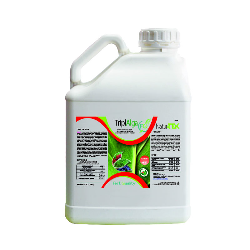 TriplAlga è un nuovo formulato a base di alghe ed estratti vegetali ricco in vitamine in acidi organici contente il nuovo compaund MF 22 (Multifacotr 22) ed ormoni naturali quali le auxine e le gibberine e le citochinine particolarmente attivi sulla pianta. La particolare formulazione di origine vegetale ricca in fenillaninna, metionina ed altri aminoacidi,di origine vegetale e la presenza di Alghe (Ascophyllum Nodosum) e Auxine naturali nonché di polisaccaridi, vitamine e minerali rendono il prodotto molto attivo nella stimolazione della pianta . Per le spiccate capacità vegeto-attivanti sui germogli, determina accrescimento e una maggiore potenzialità d’assorbimento di macro e micro-elementi. Grazie alla agli estratti vegetali presenti migliora la penetrazione dei micronutrienti migliorando così la rizosfera della pianta. Per le sue capacità vegeto – stimolanti equilibra il sistema ormonico della pianta e quindi garantisce una rapida crescita ed un migliore sviluppo radicale e fogliare nonché di fioritura e radicazione. Su culture da foglia stimola la crescita, senza incidere sulla consistenza sul colore e favorendo la sintesi e la riduzione nelle foglie di nitrati. Il formulato agisce efficacemente sulle radici di talee e plantule trapiantate, su foglie e frutti migliora la consistenza e l’accrescimento nonché la colorazione.